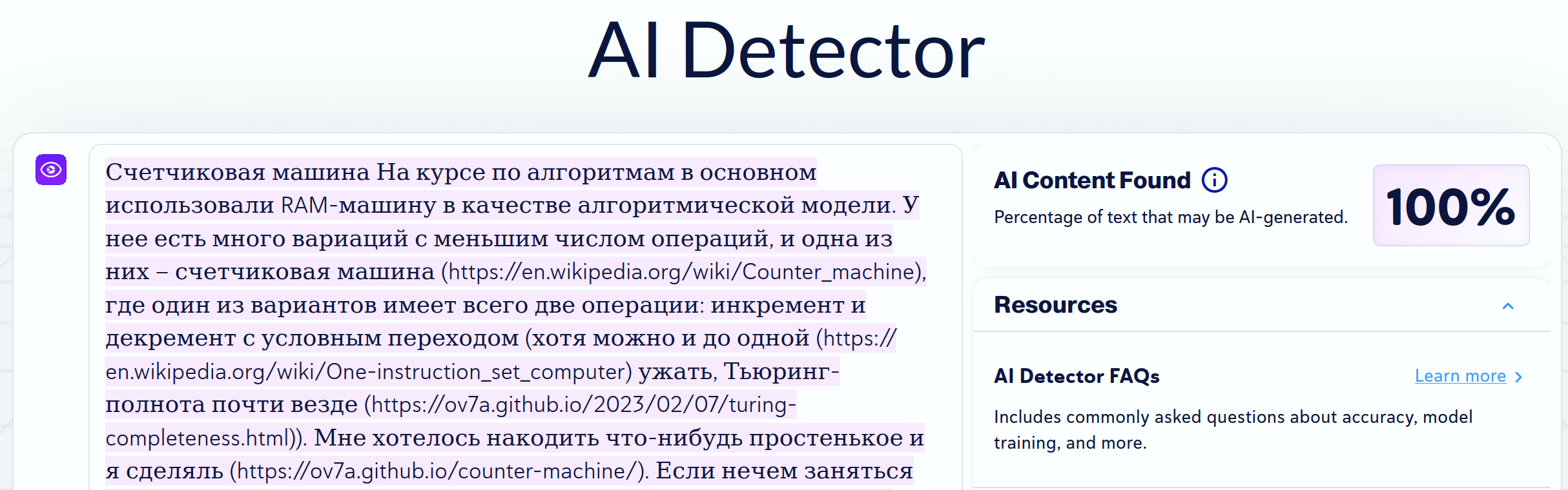 - Не обязательно верить на слово — можем проверить последний пост самостоятельно с помощью инструмента Copyleaks AI Detector — 100% результат: